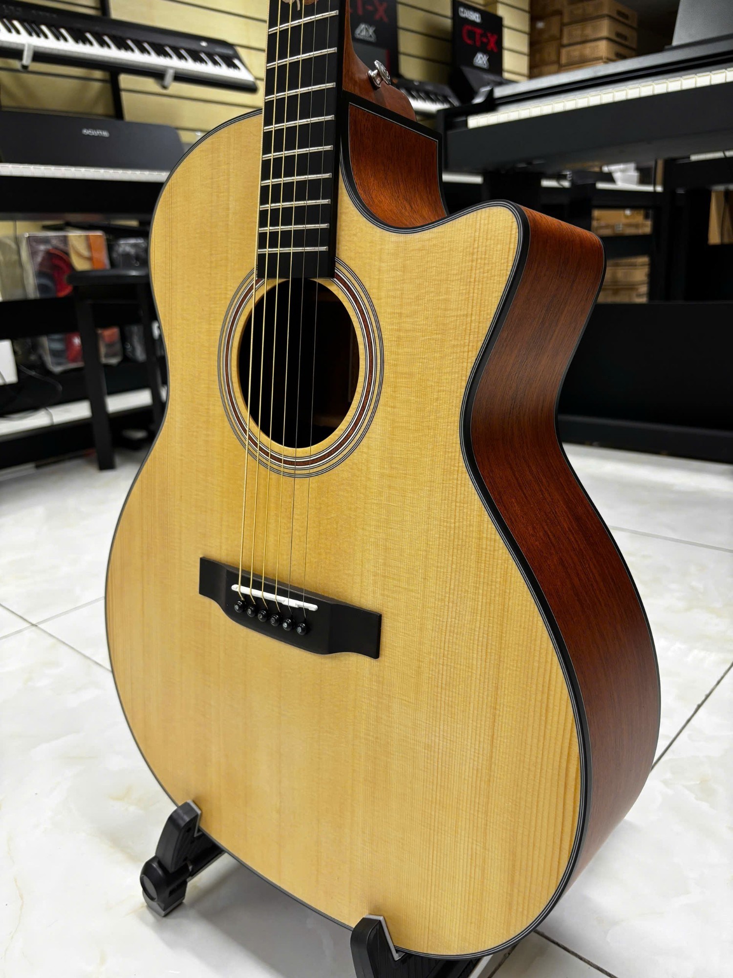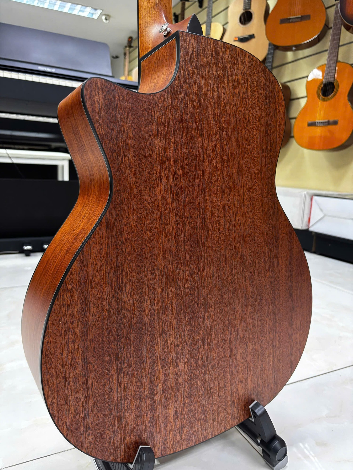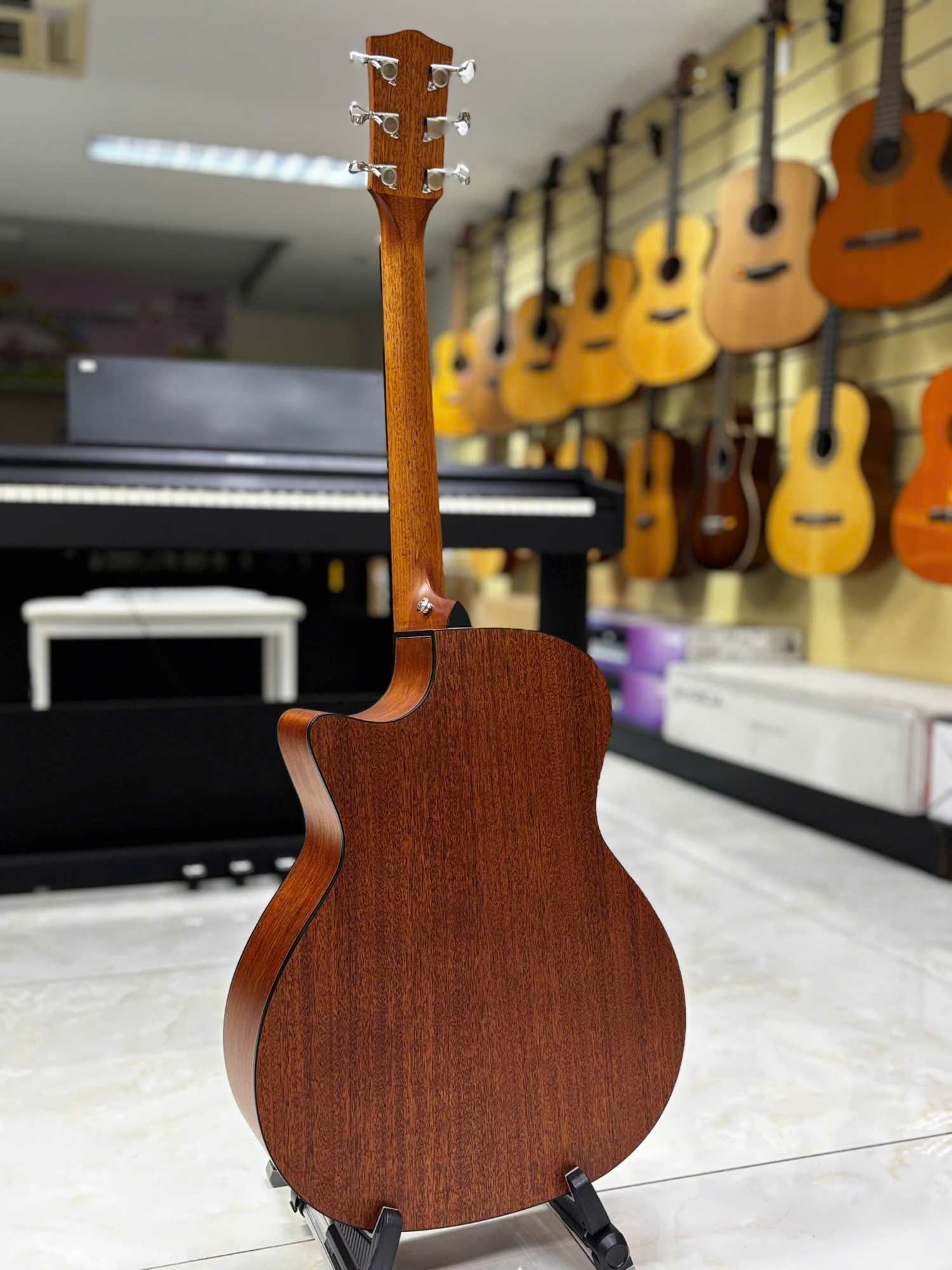 Lưng và hông đàn làm từ Mahogany mang đến chất âm trầm ấm, dày và cân bằng. Sự kết hợp giữa spruce và mahogany tạo nên tổng thể âm thanh hài hòa, phù hợp nhiều phong cách chơi từ sinh hoạt nhóm đến biểu diễn acoustic.