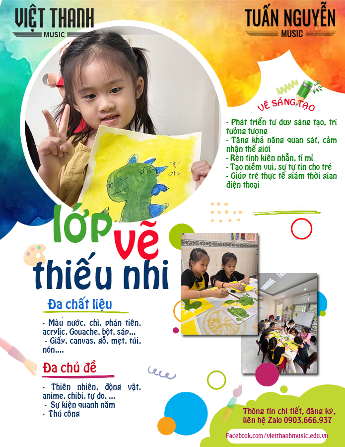 Hãy cho bé tham gia vẽ ngay tại Tuấn Nguyễn Art với chương trình dạy vẽ theo sở thích của bé, theo sự đa dạng chất liệu, đa dạng chủ đề, phát triển năng khiếu hội họa, nuôi dưỡng khả năng sáng tạo, sở thích, tạo cảm giác thoải mái, vui thích sau giờ học chính khóa ở trường, giúp trẻ phát triển tinh thần học tập tốt nhất.